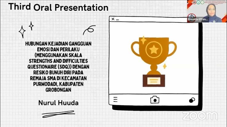 Selamat kepada dr Nurul Huda yang mendapatkan juara III dalam PIT Ansietas 2022 dengan mempresentasikan “Hubungan Kejadian Gangguan Emosi dan Perilaku (Menggunakan Skala Strengths and Difficulties Questionaire (SDQ)) dengan Resiko Bunuh Diri pada Remaja SMA di Kecamatan Purwodadi, Kabupaten Grobongan”,